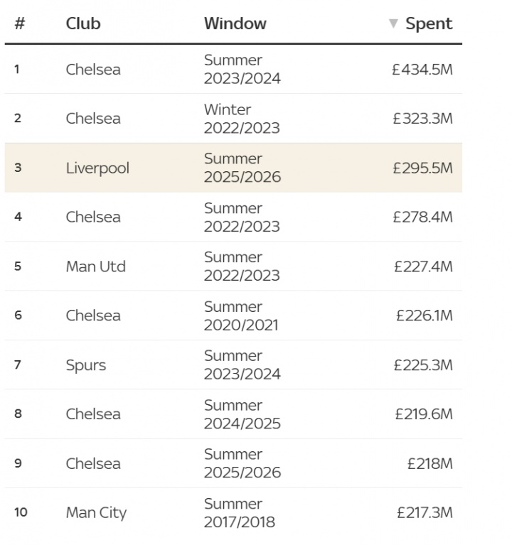 • 利物浦还花了2.95亿英镑在历史上排名第三 而切尔西则以4.34亿英镑排名第一